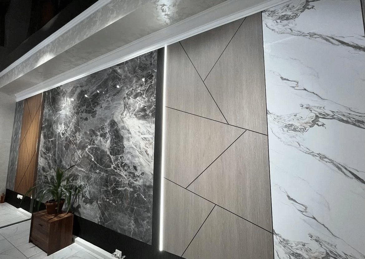 Одна панель размером 1220×2800 мм весит всего 18 кг, что покрывает площадь 3,4 м². Это значительно легче, чем керамогранит или натуральный камень. Благодаря небольшому весу, панели не требуют усиления стен или сложных каркасных конструкций. Они подходят для монтажа на любые прочные основания: бетон, кирпич, гипсокартон, ОСП и другие материалы.